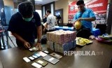 Petugas menata barang bukti uang tunai dan sabu sebelum rilis pengungkapan penyelundupan narkotia di perbatasan di BNN, Jakarta, Selasa (12/9). (FOTO : Republika/ Wihdan Hidayat)