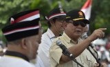 Ketua Umum sekaligus Ketua Dewan Pembina Partai Gerindra Prabowo Subianto (kanan) menyampaikan orasi dalam Aksi Bela Rohingya 169 di Monumen Patung Kuda, Jakarta, Sabtu (16/9). (FOTO : Antara/Puspa Perwitasari)