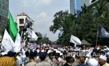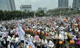 Massa Aksi Bela Rohingya 169 mendengarkan orasi Presiden PKS Sohibul Iman di Monumen Patung Kuda, Jakarta, Sabtu (16/9). (FOTO : Antara/Puspa Perwitasari)