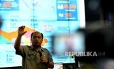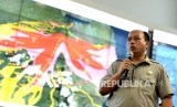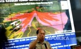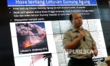 Perkembangan Aktivitas Gunung Agung. Kepala Pusat Data Informasi Humas Badan Nasional Penanggulangan Bencana (BNPB), Sutopo Purwo Nugroho memberikan paparan saat konferensi pers terkait perkembangan terkini Gunung Agung di Gedung BNPB, Jakarta, Senin (25/9). (FOTO : Republika/ Wihdan Hidayat)