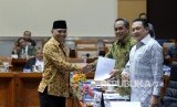 REPUBLIKA.CO.ID, JAKARTA -- Ketua KPK Agus Raharjo didampingi Wakil Ketua KPK Laode M Syarif dan Basaria Panjaitan mengikuti rapat dengar pendapat dengan Komisi III DPR di Kompleks Parlemen, Senayan, Jakarta, Selasa (26/9).