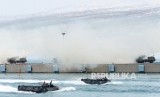 Atraksi tank amfibi saat Gladi Bersih Upacara HUT TNI ke-72 di Dermaga Indah Kiat Cilegon, Banten, Selasa (3/10). (FOTO : Republika/Wihdan Hidayat)