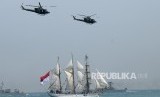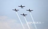 Atraksi udara Tim Jupiter TNI AY saat Gladi Bersih Upacara HUT TNI ke-72 di Dermaga Indah Kiat Cilegon, Banten, Selasa (3/10). (FOTO : Republika/Wihdan Hidayat)