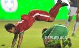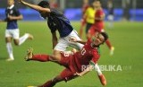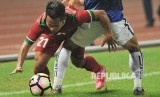 Pemain timnas Indonesia Febri Haryadi terjatuh seusai berebut bola dengan pemain lawan dalam laga uji coba melawan Kamboja di Stadion Patriot Chandrabhaga, Bekasi, Rabu (4/10). (FOTO : Republika/Edwin Dwi Putranto)