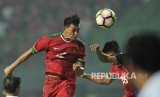 Pemain timnas Indonesia Lerby Eliandry melepaskan sundulan kearah gawang Kamboja dalam laga uji coba di Stadion Patriot Chandrabhaga, Bekasi, Rabu (4/10). (FOTO : Republika/Edwin Dwi Putranto)