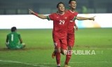 Pemain timnas Indonesia Septian David Maulana melakukan selebrasi seusai menjebol gawang Kamboja dalam laga uji coba di Stadion Patriot Chandrabhaga, Bekasi, Rabu (4/10). (FOTO : Republika/Edwin Dwi Putranto)