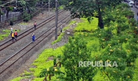 PEMANFAATAN LAHAN UNTUK RTH. Pekerja memeriksa rel di samping Ruang Terbuka Hijau (RTH) Rawajati, Pancoran, Jakarta Selatan, Jumat (6/10) (FOTO : Republika/Putra M. Akbar)