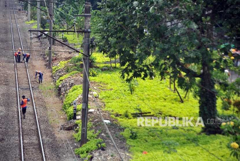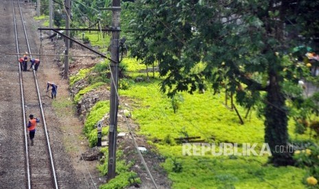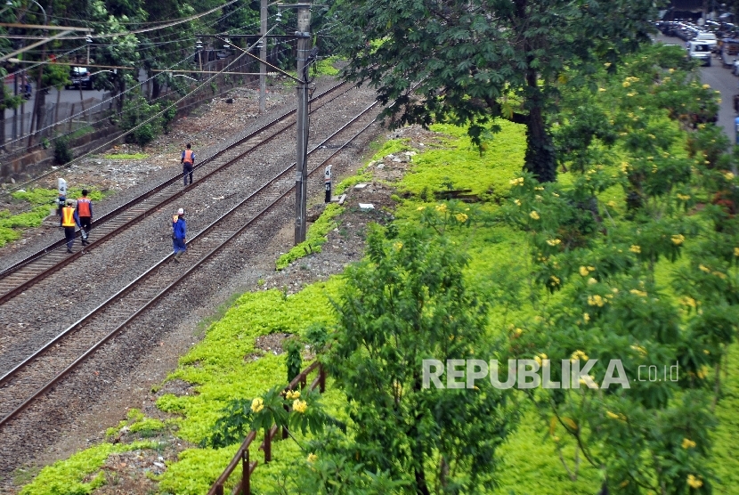 PEMANFAATAN LAHAN UNTUK RTH. Pekerja memeriksa rel di samping Ruang Terbuka Hijau (RTH) Rawajati, Pancoran, Jakarta, Jumat (6/10) (FOTO : Republika/Putra M. Akbar)