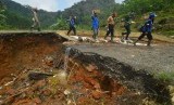 Sejumlah Taruna Siaga Bencana (Tagana) berjalan di sekitar jalan yang ambles saat membawa bantuan untuk korban longsor dan pergerakan tanah di Desa Kalijati, Kabupaten Pangandaran, Jawa Barat, Ahad (8/10). (FOTO : Antara/Adeng Bustomi)