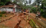 Warga gotong royong membersihkan halaman yang terdampak bencana pergerakan tanah di Desa Kalijati, Kabupaten Pangandaran, Jawa Barat, Ahad (8/10). (FOTO : Antara/Adeng Bustomi)