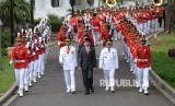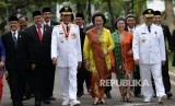 Sri Sultan Hamengku Buwono X (ketiga kiri) bersama Paku Alam X (kedua kanan) berjalan bersama rombongan usai mengikuti pengambilan sumpah jabatan Gubernur DIY oleh Presiden Joko Widodo di Istana Negara, Jakarta, Selasa (10/10). (FOTO : Republika/Wihdan Hidayat)