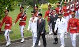 Presiden Joko Widodo (tegah) bersama Sri Sultan Hamengku Buwono X (kiri) dan Paku Alam X mengikuti kirab sebelum pengambilan sumpah jabatan Gubernur DIY di Istana Negara, Jakarta, Selasa (10/10). (FOTO : Republika/Wihdan Hidayat)