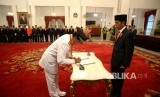 Sri Sultan Hamengku Buwono X (kiri) menandatangani berita acara bersama Presiden Joko Widodo usai pelantikan Gubernur DIY di Istana Negara, Jakarta, Selasa (10/10). (FOTO : Republika/Wihdan Hidayat)