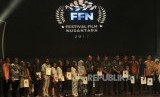 Panglima TNI Gatot Nurmayanto (keenam kanan) bersama jajarannya foto bersama pemenang pada malam penganugerahaan Festival Film Nusantara di Taman Ismail Marzuki, Cikini, Jakarta Pusat, Selasa (10/10). (FOTO : Republika/Putra M. Akbar)