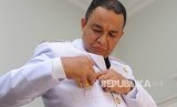 Gubernur DKI Jakarta terpilih Anies Baswedan bersiap dalam sesi fitting dan foto pakaian dinas di Kebayoran Baru, Jakarta Selatan, Kamis (12/10) (FOTO : Republika/Iman Firmansyah)