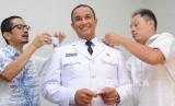 Gubernur DKI Jakarta terpilih Anies Baswedan dibantu memasang pangkat Gubernur di baju Dinas dalam sesi fitting dan foto pakaian dinas di Kebayoran Baru, Jakarta Selatan, Kamis (12/10). (FOTO : Republika/Iman Firmansyah)