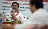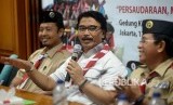 Ketua Kwarnas Gerakan Pramuka Adhyaksa Dault memberikan keterangan terkait pelaksanaan lomba tingkat lima (LT-V) gerakan pramuka di kantor Kwarnas Gerakan Pramuka, Jakarta, Kamis (12/10). (FOTO : Republika/Prayogi)