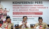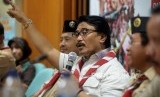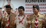 Ketua Kwarnas Gerakan Pramuka Adhyaksa Dault (tengah) bersama Wakil Ketua Kwarnas Gerakan Pramuka Bidang Bina Muda Budi Prayitno (kanan) dan Andalan Nasional Gerakan Pramuka Nurdin Hasan memberikan keterangan terkait pelaksanaan lomba tingkat lima (LT-V) gerakan pramuka di kantor Kwarnas Gerakan Pramuka, Jakarta, Kamis (12/10). (FOTO : Republika/Prayogi)