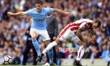 John Stones (kiri) dan Jese battle (kanan) pada pertandingan Liga Primer Ingggris antara Manchester City melawan Stoke City di Etihad Stadium, Manchester, Inggris. (FOTO : Mike Egerton/AP)