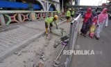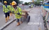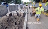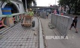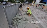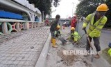REPUBLIKA.CO.ID, JAKARTA -- Pekerja menggarap pembangunan penataan jalur pedestrian di Jalan Veteran, Gambir, Jakarta Pusat, Ahad (15/10).