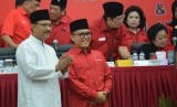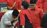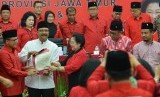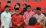 Pasangan Gubernur dan Wakil Gubernur Jawa Timur Saifullah Yusuf (kiri) dan pasangannya Azwar Annas diperkenalkan disaksikan Ketua Umum PDI Perjuangan Megawati Soekarnoputri ketika rakor pengumuman calon gubernur dan wakil gubernur di Kantor DPP PDI Perjuangan Jakarta, Ahad (15/10). (FOTO : Antara/Wahyu Putro A)