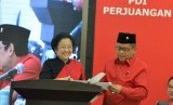 Ketua Umum PDI Perjuangan Megawati Soekarnoputri (kiri) didampingi Sekjen Hasto Kristiyanto bersiap mengumumkan pencalonan pasangan Gubernur dan Wakil Gubernur Jawa Timur dan Sulawesi Selatan ketika rakor pengumuman calon gubernur dan wakil gubernur di Kantor DPP PDI Perjuangan Jakarta, Ahad (15/10). (FOTO : Antara/Wahyu Putro A)