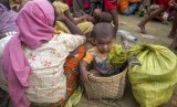 Seorang pengungsi muslim Rohingya bersama anaknya tertahan di perbatasan, setelah tentara Bangladesh melarang mereka bergerak menuju kamp pengungsian di Palong Khali, Bangladesh, Selasa (17/10). (FOTO : AP/Dar Yasin)
