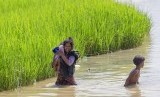 Seorang wanita pengungsi muslim Rohingya menggendong anaknya sambil menyeberangi sungai di Palong Khali, Bangladesh, Selasa (17/10). (FOTO : AP/Dar Yasin)