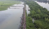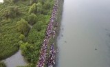 REPUBLIKA.CO.ID, Tentara penjaga perbatasan Bangladesh menghentikan arus pengungsi Muslim Rohingya yang baru tiba di perbatasan, setelah menyeberang dari Myanmar ke Bangladesh, bergerak ke depan menuju kamp-kamp pengungsi, di Palong Khali, Bangladesh, Selasa (17/10).