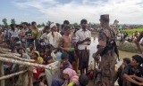 Tentara Bangladesh menghadang masuk pengungsi muslim Rohingya yang melarikan diri dari Myanmar di Palong Khali, Bangladesh, Selasa (17/10). (FOTO : AP/Dar Yasin)