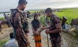 Tentara Bangladesh memeriksa seorang pengungsi muslim Rohingya yang menggendong anaknya yang sakit, sebelum mengizinkannya masuk menuju kamp pengungsian di Palong Khali, Bangladesh, Selasa (17/10). (FOTO : AP/Dar Yasin)