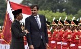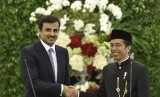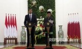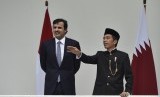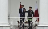 REPUBLIKA.CO.ID, BOGOR -- Presiden Joko Widodo berbincang dengan Emir Qatar Sheikh Tamim bin Hamad Al Thani saat kunjungan kenegaraan di beranda belakang Istana Bogor, Jawa Barat, Rabu (18/10).