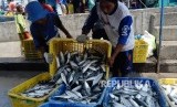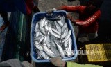 Nelayan menata ikan dalam keranjang di Pelabuhan Perikanan Muara Angke, Jakarta Utara, Sabtu (21/10). (FOTO : Republika/Yasin Habibi)