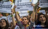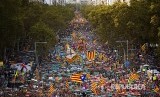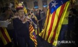 REPUBLIKA.CO.ID, KATALUNYA -- Sekitar 450 ribu warga Katalunya berkumpul di Barcelona menentang keputusan penangguhan otonomi Katalunya. Massa protes kebijakan Pemerintah Spanyol yang berencana mengambil alih kelola administrasi kawasan tersebut. Para demonstran membawa Estelada, bendera berbintang tunggal dan dua garis merah-kuning yang melambangkan kemerdekaan Katalunya. Massa memenuhi jalanan kota dan lapangan, sementara helikopter kepolisian Spanyol terbang di atas mereka.