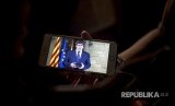 Warga Katalunya mendengarkan pidato President Carles Puigdemont pada ponsel di luar Gedung Palau Generalitat di Barcelona, (FOTO : Santi Palacios/AP)