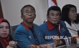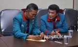 Ketua Umum Partai Idaman, Rhoma Irama berbincang Sekjen Partai Idaman, Ramdansyah saat melapor ke Kantor Bawaslu, Thamrin, Jakarta, Senin (23/10). (FOTO : Republika/Mahmud Muhyidin)