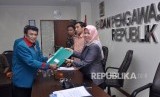 Ketua Umum Partai Idaman, Rhoma Irama (kiri) menyerahkan berkas laporan kepada Anggota Badan Pengawas Pemilu (Bawaslu) di Kantor Bawaslu, Thamrin, Jakarta, Senin (23/10). (FOTO : Republika/Mahmud Muhyidin)