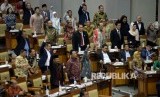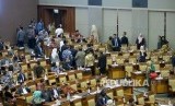Anggota dewan yang menolak RUU terkait Perppu Ormas meninggalkan ruangan sidang ketika Menteri Dalam Negeri Tjahjo Kumolo membacakan laporan pandangan pemerintah pada Rapat Paripurna pengesahan UU Ormas di Kompleks Parlemen, Senayan, Jakarta, Selasa (24/10). (FOTO : Republika/Prayogi)