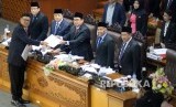 Pimpinan Rapat Paripurna Fadli Zon (ketiga kiri), Ketua DPR Setya Novanto (kedua kiri), wakil Ketua DPR Taufik Kurniawan (kiri), Agus Hermanto (kedua kanan) dan Fahri Hamzah pada Rapat Paripurna pengesahan UU Ormas di Kompleks Parlemen, Senayan, Jakarta, Selasa (24/10). (FOTO : Republika/Prayogi)