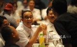 Menyapa. Gubernur DKI Anies Baswedan dan Wakil Gubernur Sandiaga Uno menyapa jurnalis dalam acara Coffe Morning bersama Jurnalis di Balai Agung, Balaikota DKI Jakarta, Jakarta, Rabu (25/10). (FOTO : Republika/Iman Firmansyah)