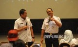 Tertawa. Gubernur DKI Anies Baswedan dan Wakil Gubernur DKI Sandiaga Uno tertawa saat bercanda di hadapan jurnalis dalam acara Coffe Morning bersama Jurnalis di Balai Agung, Balaikota DKI Jakarta, Jakarta, Rabu (25/10). (FOTO : Republika/Iman Firmansyah)