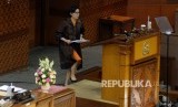 Menkeu Sri Mulyani bersiap memberikan laporan pandangan pemerintah pada sidang Paripurna di Gedung Nusantara II, Kompleks Parlemen, senayan, Jakarta, Rabu(25/10). (FOTO : Republika/Prayogi)