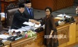 Menkeu Sri Mulyani (kanan) menyerahakan laporan pandangan pemerintah kepada pimpinan rapat Paripurna Taufik Kurniawan (kiri) disaksikan wakil ketua DPR Agus Hermanto (kedua kiri) sidang Paripurna di Gedung Nusantara II, Kompleks Parlemen, senayan, Jakarta, Rabu(25/10). (FOTO : Republika/Prayogi)