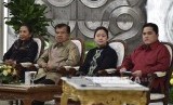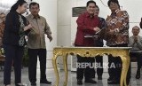 Wakil Presiden Jusuf Kalla (kedua kiri) didampingi Menko Pembangunan Manusia dan Kebudayaan Puan Maharani (kedua kanan), Menteri BUMN Rini Soemarno (kiri) dan Ketua Pelaksana INASGOC Erick Thohir (kanan) menghadiri penandatanganan kerja sama INASGOC dengan enam BUMN di Kantor Wakil Presiden, Jakarta, Rabu (25/10). (FOTO : Puspa Perwitasari/Antara)