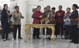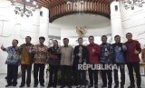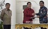 Ketua Pelaksana INASGOC Erick Thohir (kedua kanan) dengan Dirut PT Pertamina Elia Massa Manik (kanan) di Kantor Wakil Presiden, Jakarta, Rabu (25/10). (FOTO : Puspa Perwitasari/Antara)