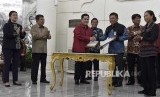 Menteri BUMN Rini Soemarno (kanan) menyaksikan penandatanganan kerjasama pendanaan Asian Games 2018 oleh Ketua Pelaksana INASGOC Erick Thohir (ketiga kiri) dengan Dirut Bank BRI Suprajarto (keempat kanan) di Kantor Wakil Presiden, Jakarta, Rabu (25/10). (FOTO : Puspa Perwitasari/Antara)