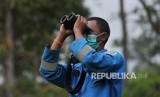 Petugas dari Pusat Konservasi Elang Kamojang (PKEK) melakukan observasi seusai pelepasliaran sepasang Elang Ular Bido (Spilornis Cheela) di kawasan Hutan Kamojang, Kabupaten Garut, Jawa Barat (FOTO : Republika/Edwin Dwi Putranto)
