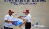 Direktur Utama PT Perusahaan Gas Negara (persero) Tbk Jobi Triananda Hasjim (kiri) menyerahkan beasiswa pada Direktur Pendidikan Universitas Airlangga Bambang Sektiari Lukiswanto (kanan) saat kegiatan (FOTO : M Risyal Hidayat/Antara)
