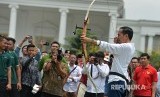 Presiden Joko Widodo membidik anak panah ke sasaran di sela peringatan Hari Sumpah Pemuda ke-89 di Halaman Istana Bogor, Jawa Barat, Sabtu (28/10). (FOTO : Wahyu Putro/Antara)