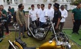 Presiden Joko Widodo (tengah) mengamati motor modifikasi yang dipamerkan saat peringatan Hari Sumpah Pemuda ke-89 di Halaman Istana Bogor, Jawa Barat, Sabtu (28/10). Peringatan dengan konsep bernuansa anak muda yang diikuti sekitar 1.000 pemuda berprestasi dari berbagai daerah di Indonesia tersebut mengangkat tema (FOTO : Wahyu Putro/Antara)